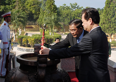 Thủ tướng Nguyễn Tấn Dũng và Thủ tướng Campuchia Hun Sen dâng hương tưởng niệm