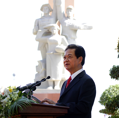 Phát biểu tại buổi lễ, Thủ tướng Nguyễn Tấn Dũng nhấn mạnh, Việt Nam- Campuchia là hai nước láng giềng, sông suối, đất đai liền một dải. Nhân dân Việt Nam và nhân dân Campuchia có quan hệ hữu nghị truyền thống tốt đẹp từ lâu đời, đã cùng nhau đoàn kết, gắn bó keo sơn trong công cuộc đấu tranh giành độc lập, tự do của mỗi nước. Nhân dân Việt Nam luôn trân trọng, biết ơn và mãi mãi ghi nhớ hình ảnh những cán bộ, chiến sĩ và người dân Campuchia đã kề vai, sát cánh cùng quân đội và nhân dân Việt Nam, anh dũng chiến đấu để đem lại độc lập, tự do cho cả hai dân tộc.